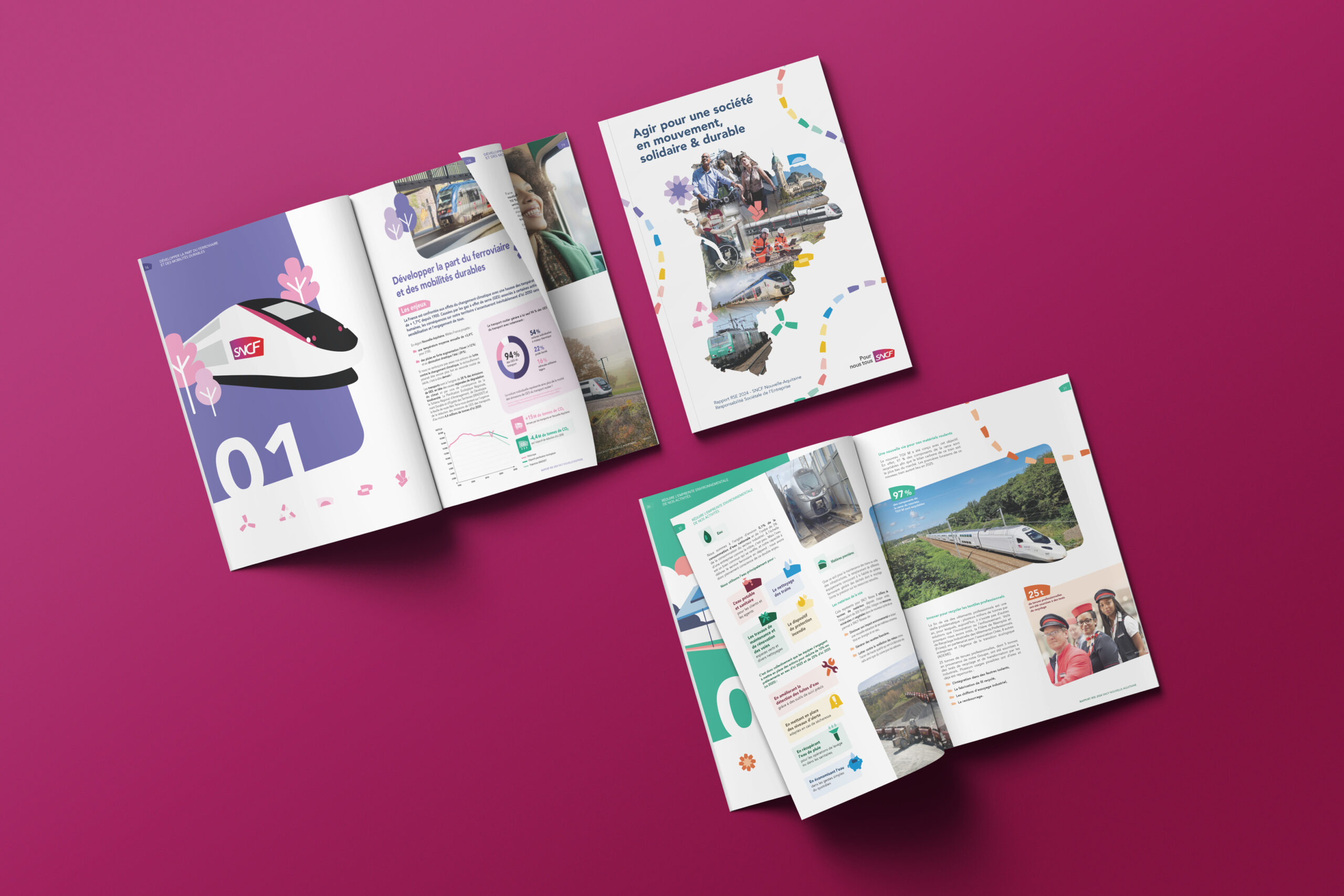 Avec la SNCF, ça matche sur plusieurs terrains : Réseau, Gares & Connexions, Voyageurs. Trois entités au compteur, et ici, un projet d’envergure à bord : le nouveau rapport RSE du Groupe SNCF Nouvelle-Aquitaine. Notre mission ? Imaginer la DA, lui donner un coup de peps et le mettre en page pour en faire un support à la fois informatif, vivant et mais aussi très engageant !